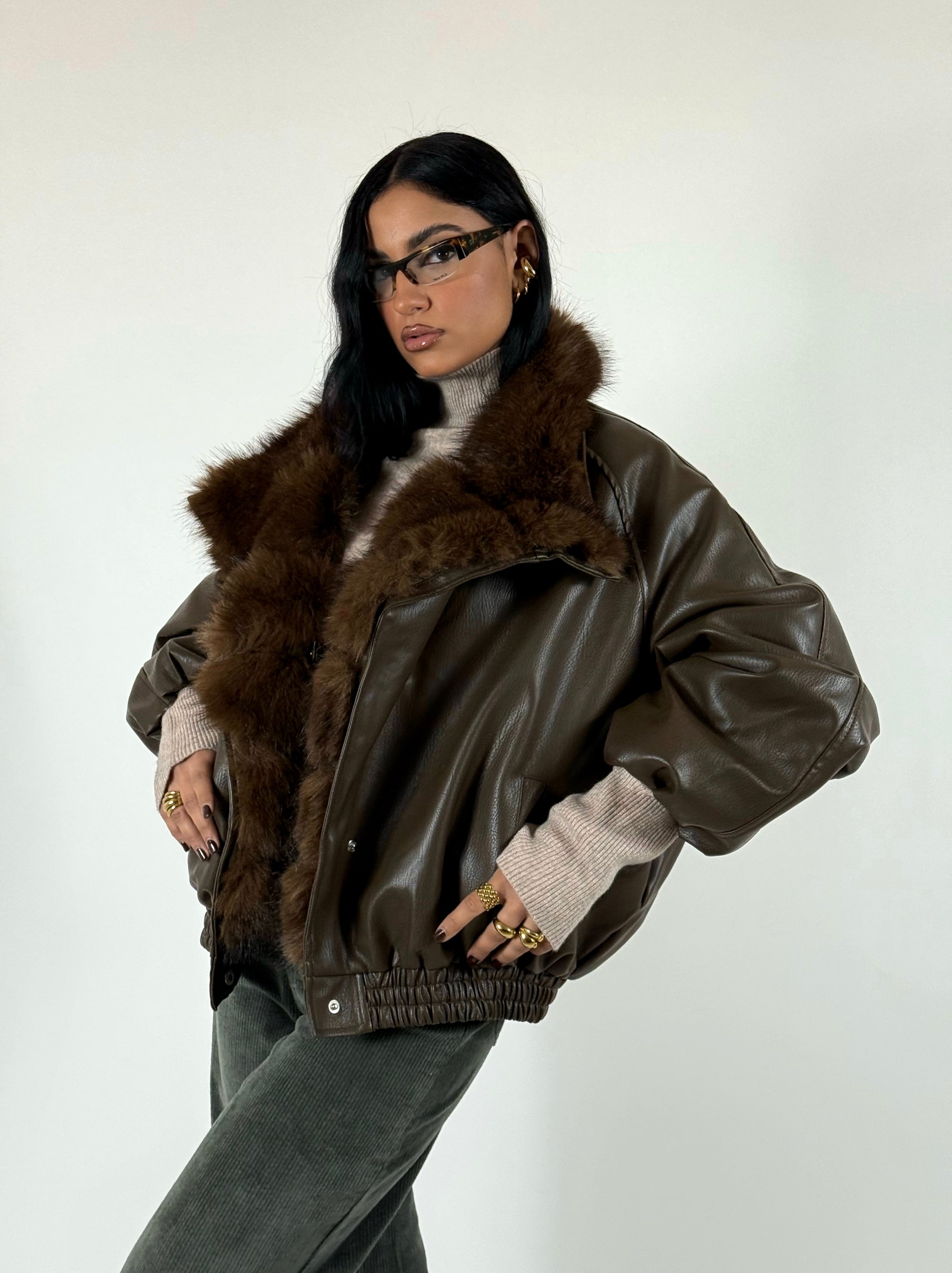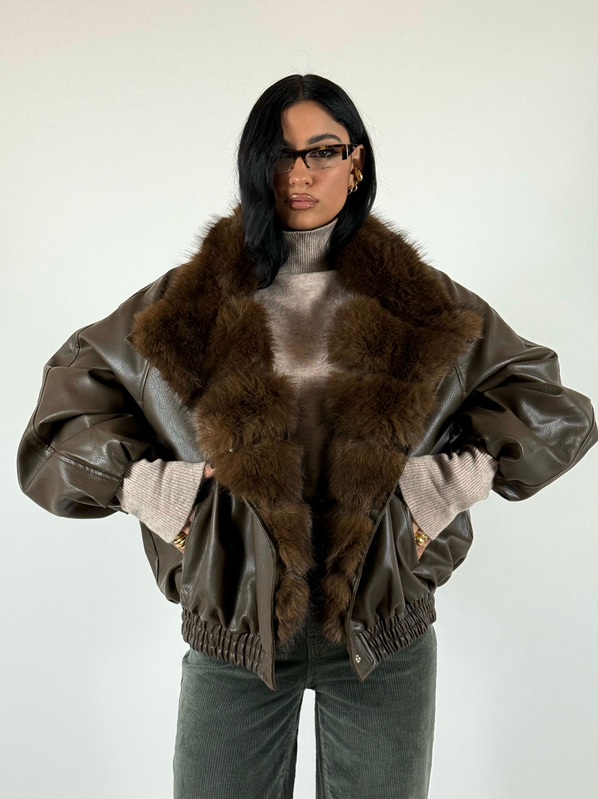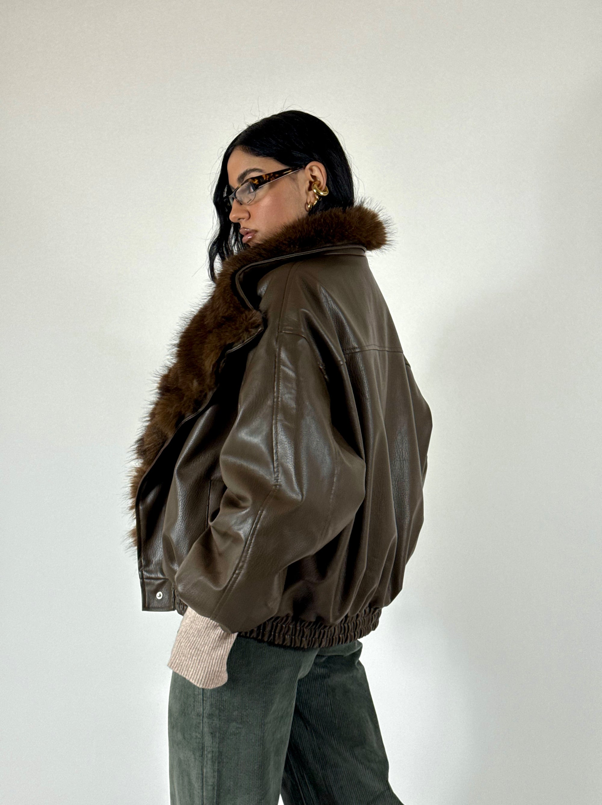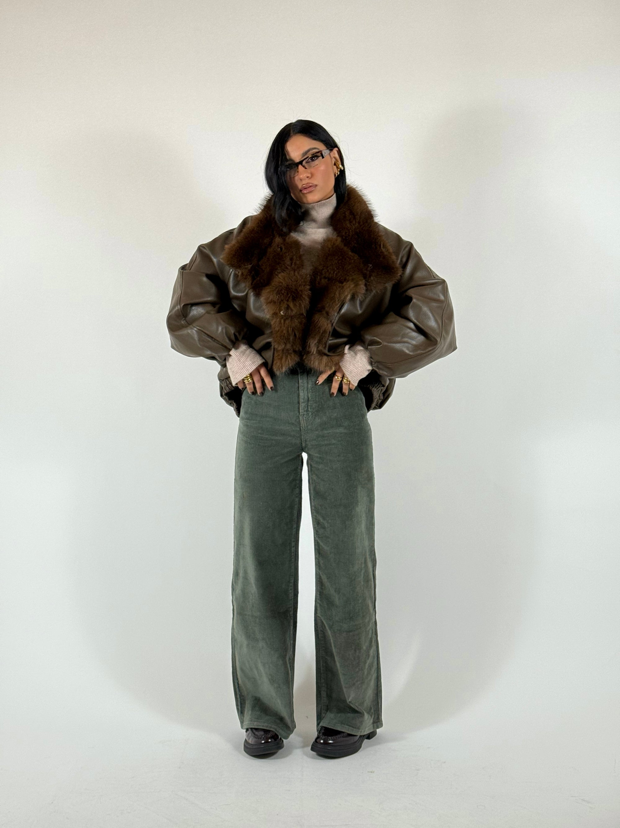 Bomber scamosciato con elastico sul finale, vestibilità oversize, consigliata fino a taglia 46.